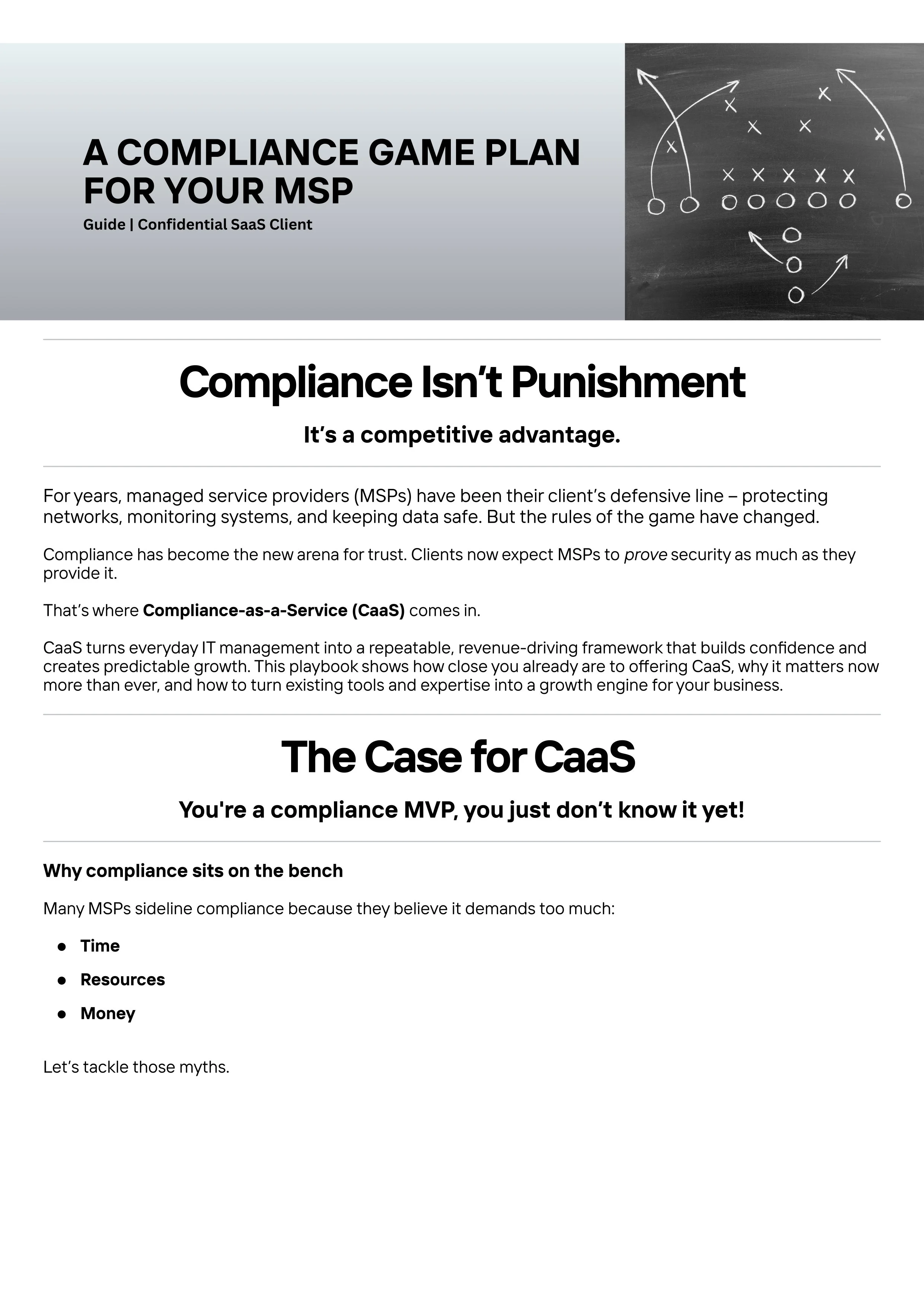 I authored a gated educational guide that served as the lead asset in a five-part Compliance-as-a-Service (CaaS) campaign for a SaaS scale-up targeting managed service providers (MSPs). Written as a sports “playbook,” it reframed compliance as a scalable service opportunity already embedded in their existing operations.